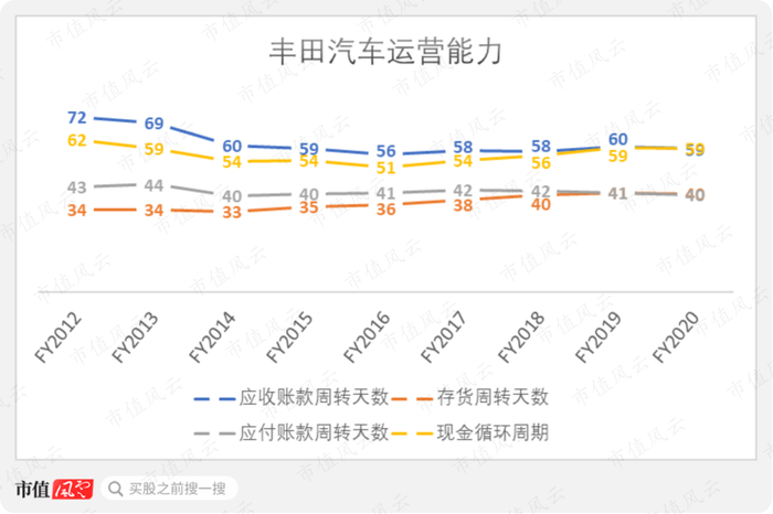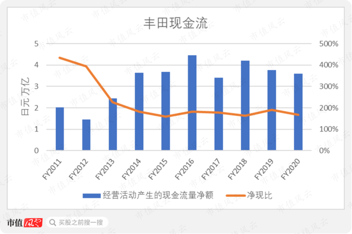2020财年,丰田的经营活动净现金流为3.59万亿日元,净现比为168%。利润很好地转化为了现金。