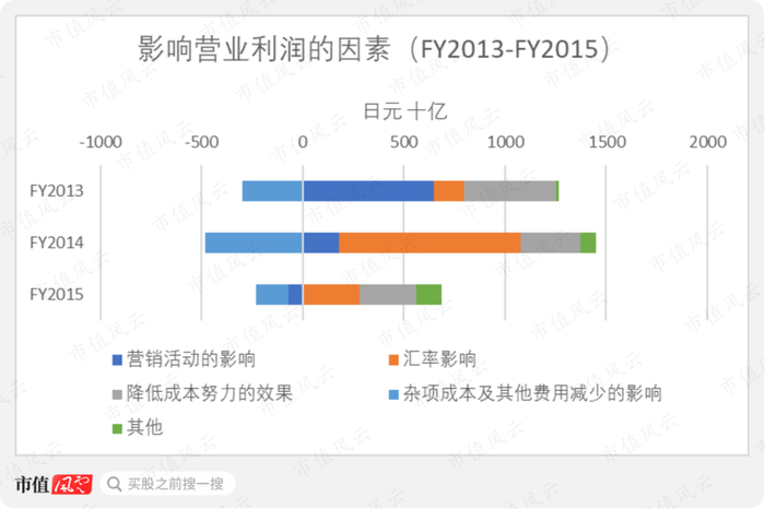 2013-2015财年,营业利润增长的主要因素首先是汇率,然后是公司层面的降成本(cost reduction effort),最后是营销活动的影响。