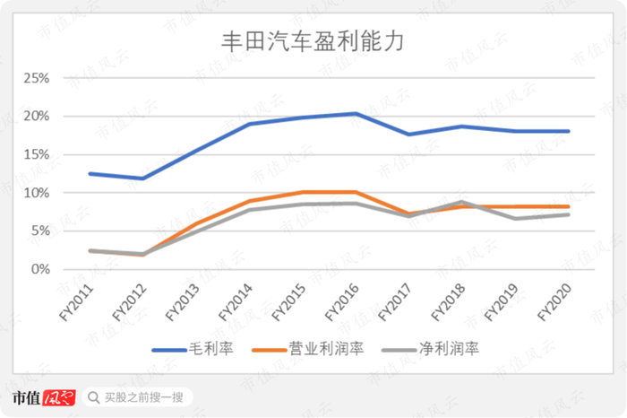 2020财年,丰田公司的毛利率为18.1%,营业利润率和净利润率分别为8.2%、7.2%。