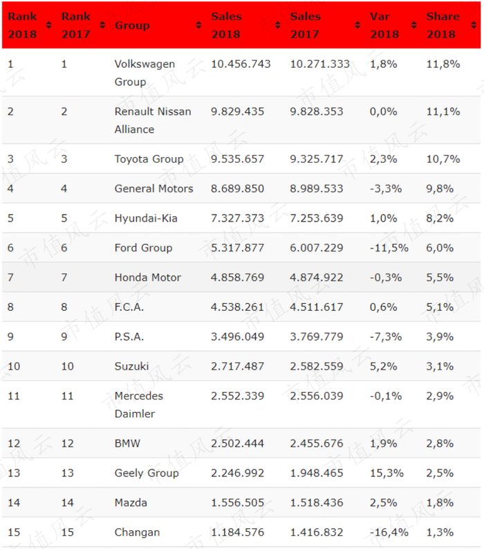 2019年,排名前三的则分别是大众、丰田、雷诺日产联盟,丰田上升一位。三家公司的市场份额分别为12.2%、11.4%、10.9%。