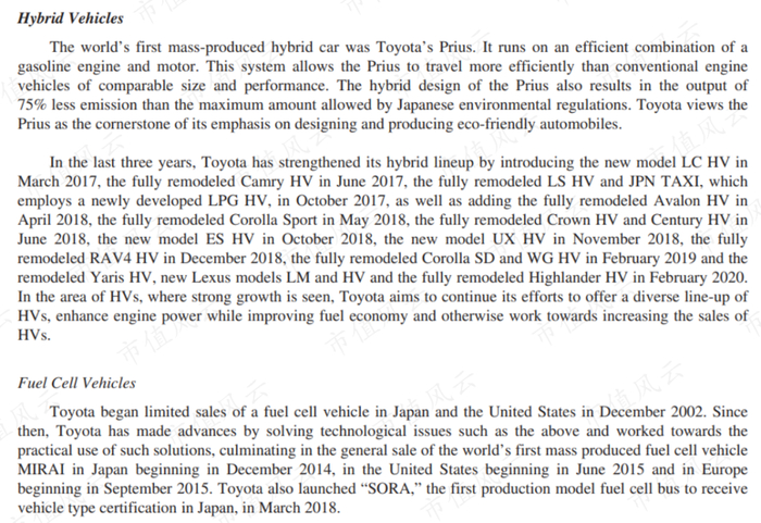 直到最新的2020财年年报中,丰田还把新能源产品的重点放在混动车和燃料电池车(FCV)上,丝毫没有提及纯电动车。
