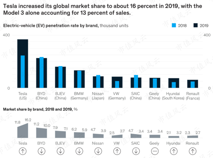 2019年全年,包含纯电动和插电式混动车在内的销量排行榜中,特斯拉排名第一,市场份额达到16.2%,同比提高了4.4个百分点。比亚迪排名第二,市场份额达到10.0%。