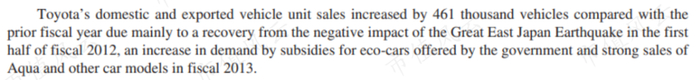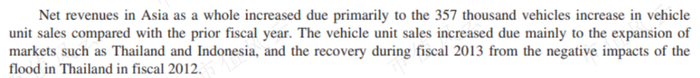 近十年来唯一的一次两位数增长发生在2013财年,当时的销量大幅增长了20.7%。这与上一财年东日本大地震、泰国洪水造成的基数较低,政府补贴导致的环保型车辆需求增加,以及北美市场的稳健复苏有关。