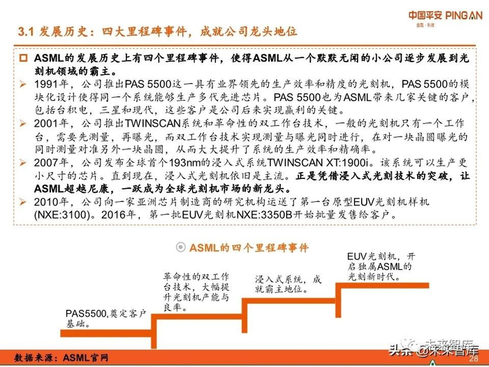 推出PAS 5500、双工作台、浸入式光刻机、EUV光刻机是公司发展历史上的四大里程碑事件,使得ASML从一个默默无闻的小公司逐步发展到光刻机领域的霸主。
