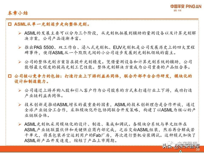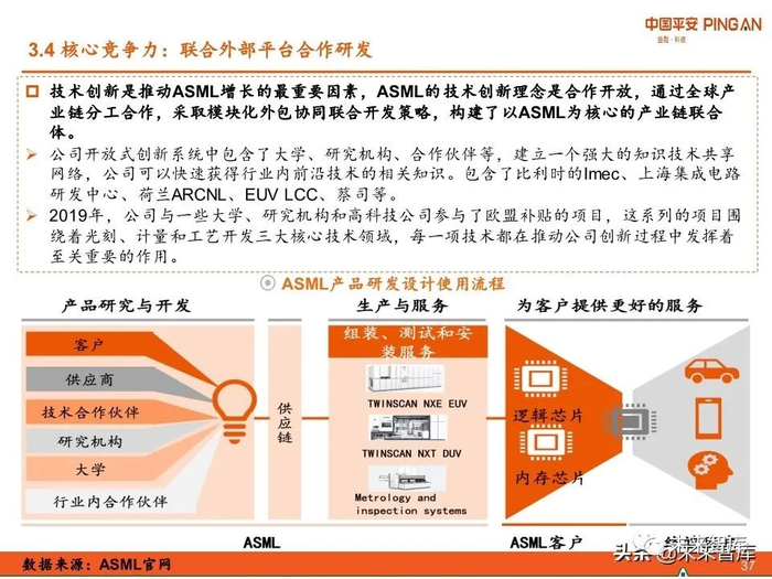 技术创新是推动ASML增长的最重要的因素,ASML的技术创新理念是合作开放,通过 全球产业链分工合作,采取模块化外包协同联合开发策略,构建了以ASML为核心的产 业链联合体。