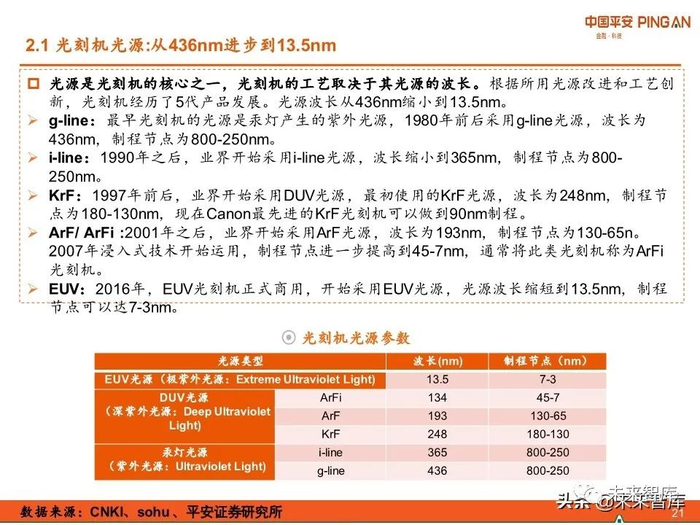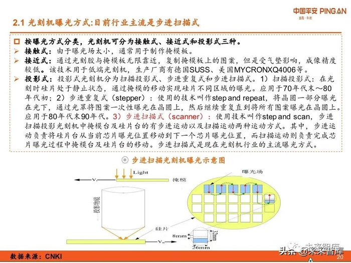 光刻机经历了5代产品发展,光源波长从436nm缩小到13.5nm;目前主流的曝光方式是 步进扫描式。