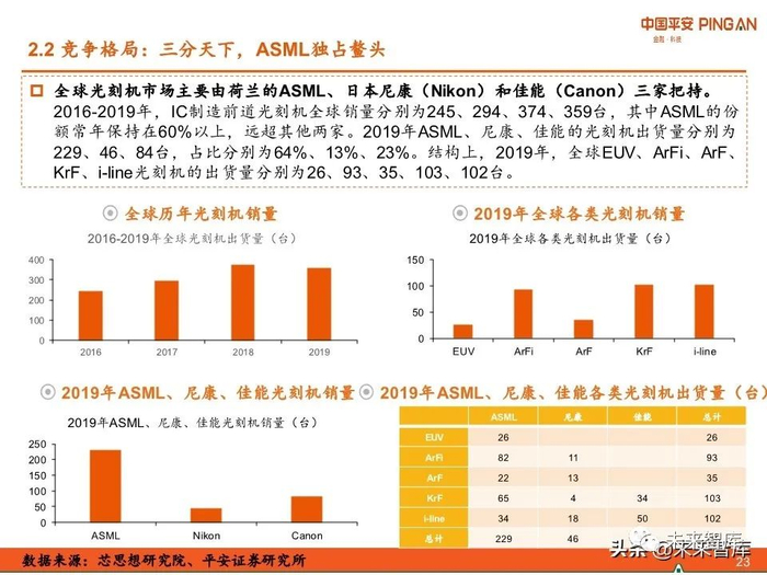 全球光刻机市场主要由荷兰的ASML、日本尼康(Nikon)和佳能(Canon)三家把持,其 中ASML独占鳌头。