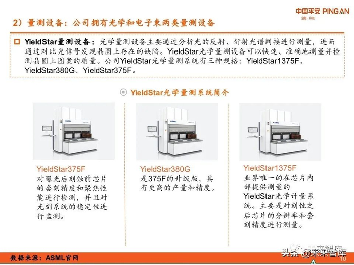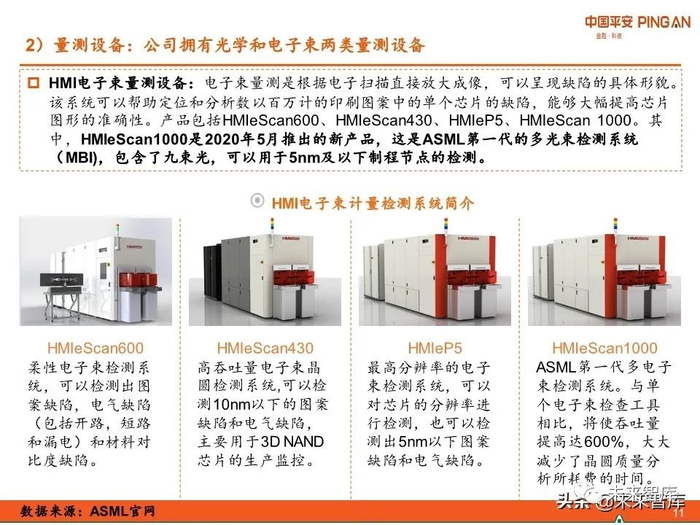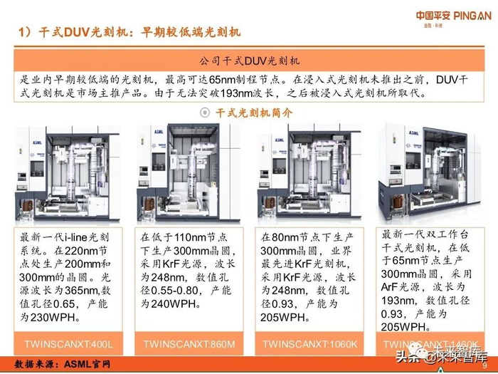 ASML的产品包括光刻机、量测设备以及计算光刻解决方案。其中光刻机有EUV光刻机 和DUV光刻机(DUV光刻机进一步分为浸入式光刻机和干式光刻机),量测设备包括 YieldStar量测设备和HMI电子束量测设备。