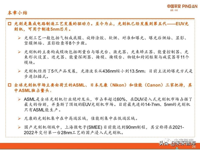 国产光刻机领域中,上海微电子(SMEE) 目前能达到90nm制程,其宣称将在2021- 2022年交付第一台28nm工艺的国产浸入式光刻机。