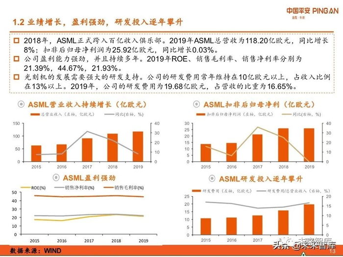 2019年ASML的总营业收入为118.20亿欧元,同比增长8%;扣非后归母净利润为25.92 亿欧元。公司毛利常年维持在40%以上,净利率在20%以上。
