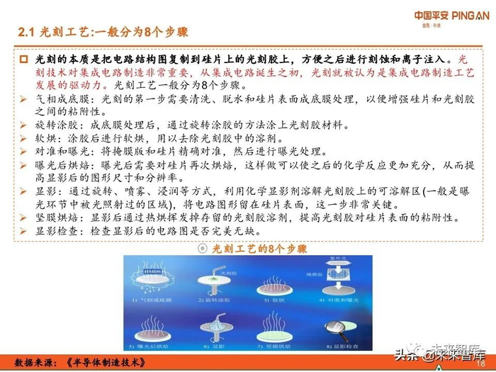 光刻工艺一般包括气相成底膜、旋转涂胶、软烘、对准和曝光、曝光后烘焙、显影、 坚膜烘焙、显影检查等8个步骤。
