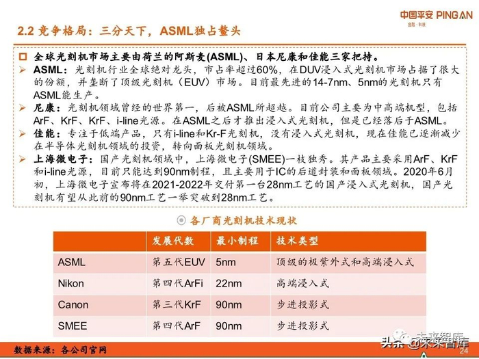 ASML是全球光刻机行业绝对龙头,市占率超过60%,在DUV浸入式光刻机市场占据了 最大的份额,并垄断了顶级的EUV光刻机市场。目前最先进的14-7nm、5nm的光刻机 只有ASML能生产。