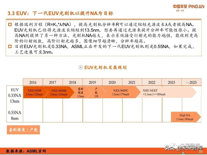 ASML未来光刻机的研发主要集中在高数值孔径技术,不断优化EUV光刻机的性能,提 供更高的分辨率和套刻精度。