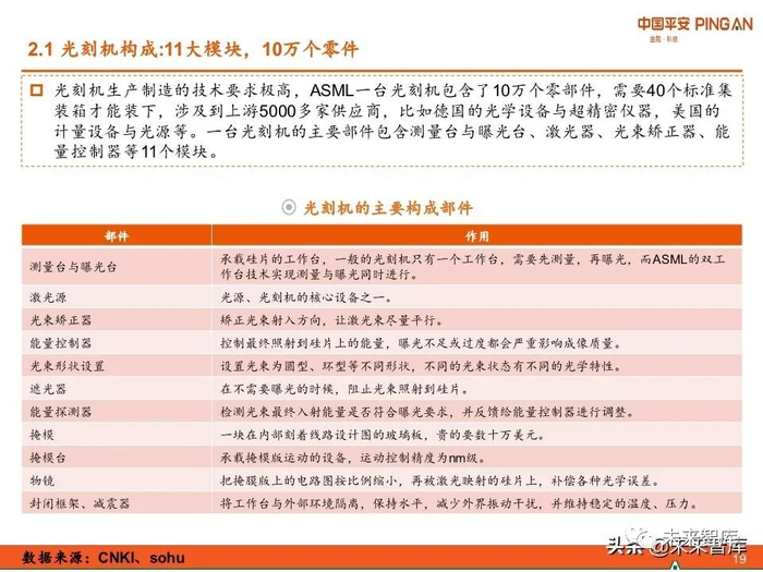 光刻机的主要构成模块包括测量台与曝光台、激光器、光束矫正器、能量控制器、光 束形状设置、遮光器、能量探测器、掩模、掩模台、物镜和封闭框架与减震器等11个 模块。