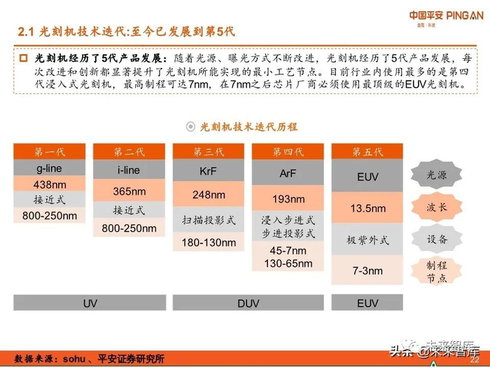 光刻是集成电路制造工艺发展的驱动力。至今为止,光刻机已经发展到第五代——EUV光 刻机,可用于制造5nm芯片。