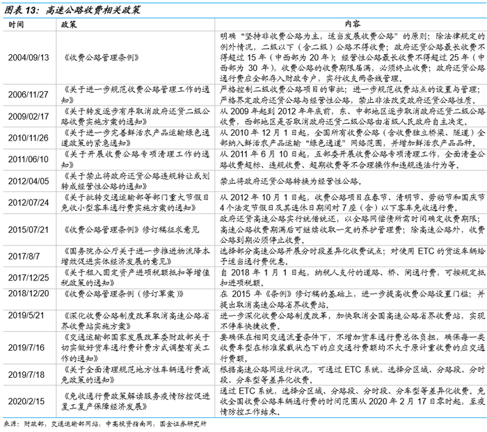 2019年5月,国务院办公厅发布《深化收费公路制度改革取消高速公路省界收费站实施方案》,提出加快取消全国高速公路省界收费站,实现不停车快捷收费,布进一步深化了收费公路制度改革。2020年2月15日,交通运输部发文,免收全国收费公路车辆通行费的时间范围从2020年2月17日零时起,至疫情防控工作结束。