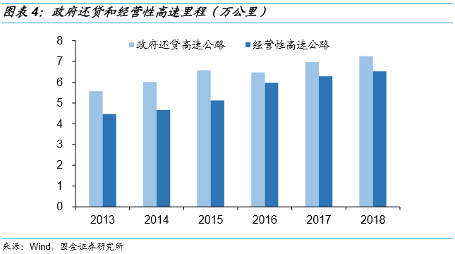 2013-2018年,政府还贷和经营性高速公路里程年复合增长率分别为4.51%、6.51%,经营性高速公路的增长速度总体上略快于政府还贷高速公路。截至2018年底,我国政府还贷高速公路与经营性高速公路各占半壁江山,政府还贷与经营性高速公路占比分别为52.64%、47.36%。