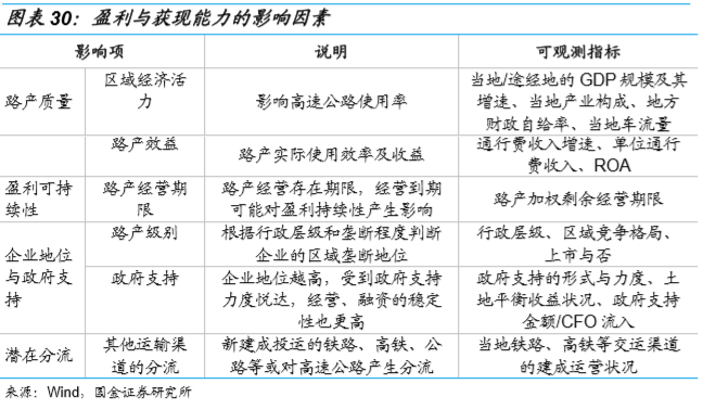 从上述的区别可见,在对高速公路主体分析时,需要区分不同高速公路类型。政府还贷公路占比较大的企业,其偿债主要依赖于地方政府财力,以及政府债务置换情况;而经营性公路为主导的企业,则更多关注经营路产的盈利能力、地方政府的支持程度以及给予土地平衡收益的情况。