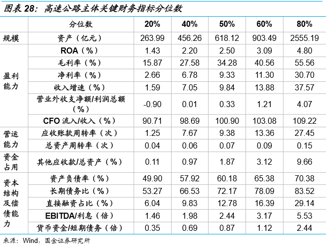 从高速公路发债主体整体的财务指标看,收入处于稳步增长中,盈利质量较高,但由于资产规模较大,ROA和总资产周转率均较低;资本结构上,资产负债率中枢水平约为60%,杠杆水平适中,负债以长期融资、间接融资为主,盈利对利息的保障程度较好,货币资金对短期债务的覆盖程度较低。