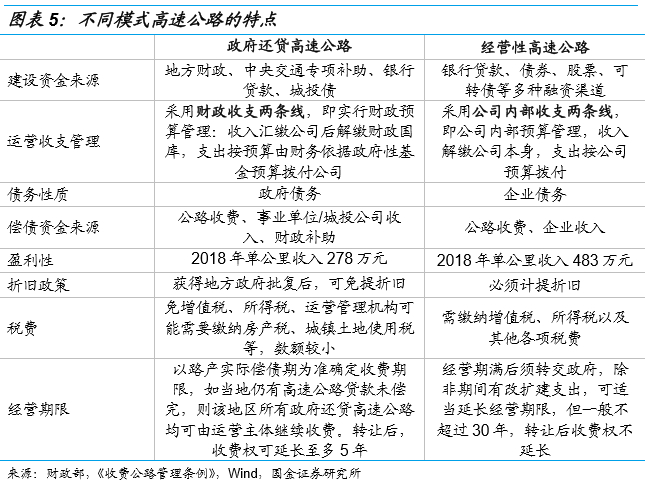 我国的高速公路主要有两种模式:政府还贷高速公路和经营性高速公路。政府还贷高速公路是指县级以上地方人民政府交通主管部门利用贷款或者向企业有偿集资建设的高速公路,该种模式下,政府只是依托企业来进行投资建设和运营,投资与后期运营资金均来源于政府,运营收入也需要由企业上收后解缴地方财政。经营性高速公路是指国内外经济组织投资建设或者依法受让获得收费权并运营的高速公路,主要采用BOT或TOT模式。