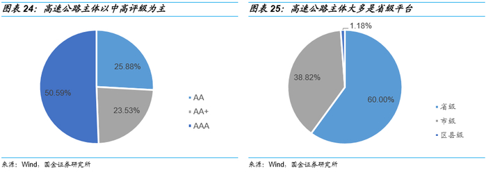 我们从有存量债券的主体中筛选出主营业务为高速公路建设和运营的主体,经整理,有存量债的高速公路主体共85家,均为地方国企,符合高速公路区域垄断的特点;主体评级以中高评级为主,AAA、AA+和AA占比分别为50.59%、23.53%和25.88%;平台层级以省级平台为主,具体来看,省级、市级、区县级平台占比分别为60.00%、38.82%及1.18%。