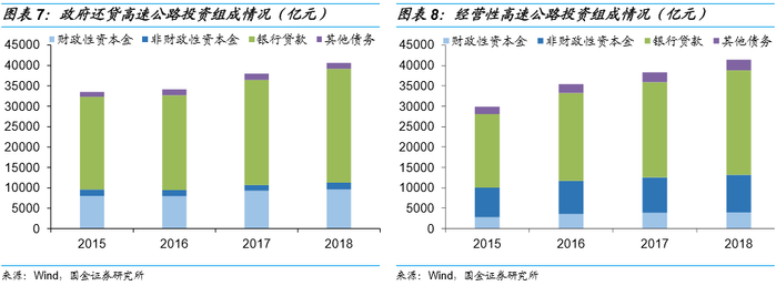 高速公路由于投资额大、回收周期长,因此往往采用高负债运营模式,银行贷款为主要融资来源。2018年,政府还贷高速公路资本金占比27.77%,以财政性资本金为主,银行贷款占比68.64%,其他债务占比3.58%;经营性高速公路资本金占比31.80%,以非财政资本金为主,银行贷款占比61.97%,其他债务占比6.41%。总体来说,两种高速公路都以银行借款为主要融资来源,融资渠道较为单一,但相对而言政府还贷高速公路对银行贷款的依赖程度相对更高。
