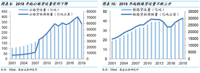 受“公转铁”政策的影响,高速公路的需求端受到其他运输渠道挤压的情况日益明显。2018年6月27日,国务院常务会议提出要调整运输结构,提高运输效率,降低实体经济物流成本,要更好发挥铁路在大宗物资运输、长距离运输中的骨干作用,力争到2020年,大宗货物年货运量在150万吨以上的工矿企业和新建物流园区接入铁路专用线比例、沿海重要港区铁路进港率分别达80%、60%以上[3]。随后,2018年9月17日,《国务院办公厅关于印发推进运输结构调整三年行动计划(2018—2020年)的通知》(国办发[2018]91号)出台,正式确定“提升铁路运能、升级水运系统、治理公路货运”的策略。自此以后公路货运量及公路货物周转量大幅下降,2019年降幅分别为13.24%、16.24%;铁路货运量和铁路货物周转量则进一步增长,2019年增幅分别为7.20%、4.35%。