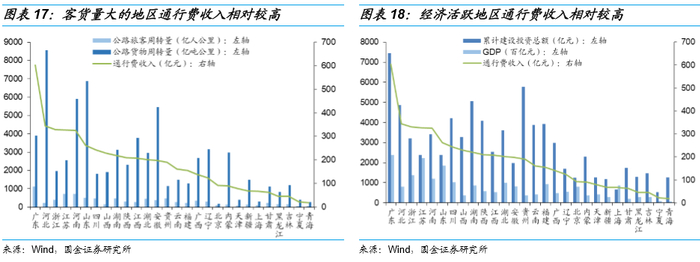 影响高速公路通行费收入的直接因素主要是高速公路里程数和相应的客货车周转量,其背后的决定因素则是区域经济水平和高速公路投资额等因素。一方面来看,公路旅客周转量和公路货物周转量较高的省份,如广东、河北、河南、山东等地区,往往路网密度较高,单位旅客及货物流量较大,相应的通行费收入也较高;另一方面,GDP、高速公路建设投资总额较高的地区,如广东、浙江、江苏、山东等省,其经济较为活跃,高速公路利用率较高,相应通行费收入也较为可观。