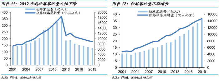 同时,近几年来,随着铁路网络的不断发展完善,人们的出行习惯也发生了一定改变。2013年开始,公路客运量整体处于下降趋势,2019年公路客运量和公路旅客周转量分别为130.10亿人、8857.10亿人公里,不足2012年巅峰时期的一半;而铁路客运量及铁路旅客周转量不断增长,年复合增长率分别为8.22%、4.80%。