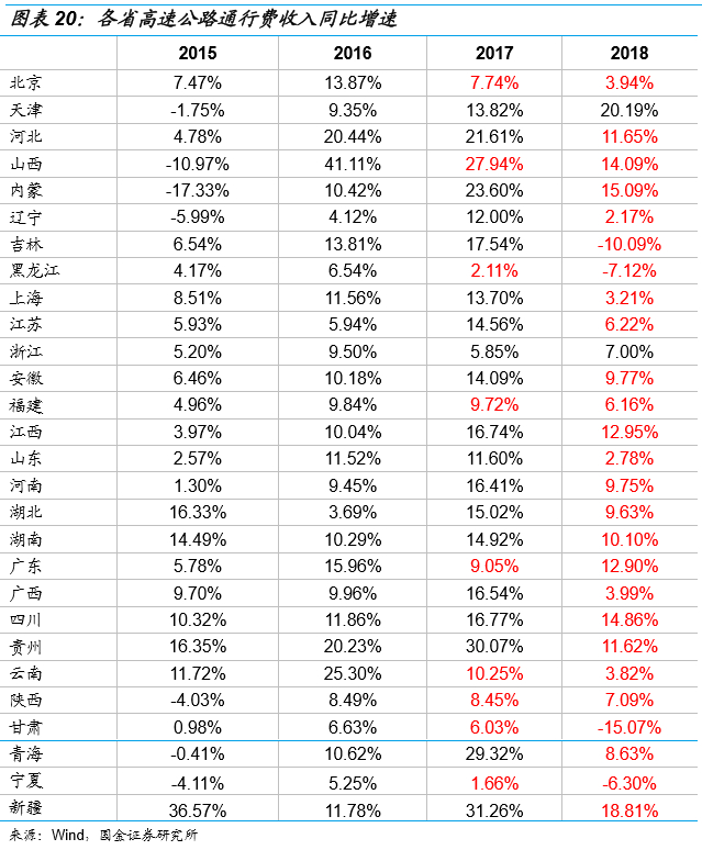 分省(自治区、直辖市)来看,除天津和浙江外,其他各省(自治区、直辖市)高速公路通行费收入同比增速2018年均放缓,有部分省份甚至负增长,如吉林、黑龙江、甘肃、宁夏。