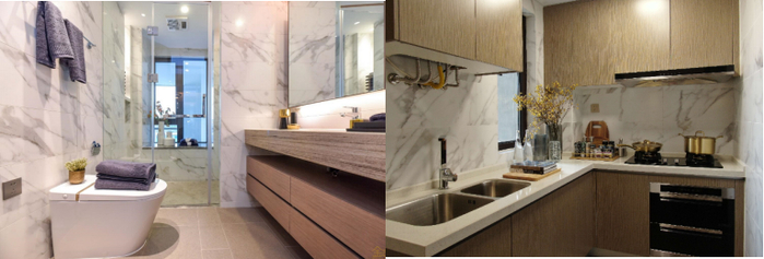 项目精装展示样板间在1号楼实景展示,公告区域也是实景交付的标准,可以看到整体交付风格和公区风格搭配采用浅灰搭配,高端显档次,精装也是配备中央空调、新风、地暖,所用品牌为市面上认可度最高的三大件品牌:东芝变频空调、兰舍新风、德国菲斯曼地暖,是目前地暖行业的顶尖国际品牌;除三大件外,厨电系列使用的是高端厨电品牌卡萨帝,洁具使用的是科勒,五金龙头使用的是摩恩,大件已达到市面上80%高标准要求,细节更是匠人匠心铸造,从客户角度出发,为人居生活而来。