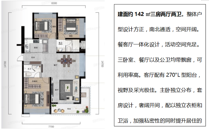 大三居的户型设计除了考虑到空间利用率和收纳功能外,部分户型配备独立电梯入户、270°超大L型阳台、13.4米南向面宽、6.6米观景阳台、南北双阳台设计等,在功能上更完善,空间上更开阔,活动空间更为充足,大尺度的落地窗和超宽观景阳台,都兼顾观景瞰江资源最大化。