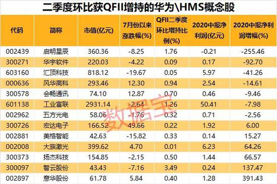 另外,净利润同比增长近4倍的华为概念股意华股份二季度获QFII新进持有0.4%的股份。获QFII增持的大族激光7月份以来还得获北上资金加仓,QFII持股+北上资金持股比例合计超过20%,7月份以来股价上涨4.7%。大族激光向华为提供激光标记、激光切割、激光焊接、自动化等设备及相关系统解决方案。