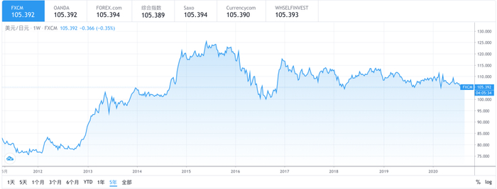 美元兑日元汇率走势近几年基本稳定在105水平线附近。(图片来源:tradingview)