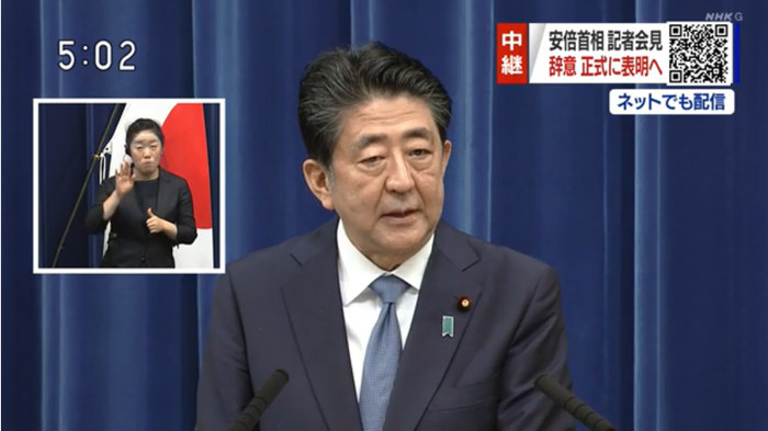 8月28日,日本首相安倍晋三召开记者发布会,宣布辞职。(图片来源:NHK电视台直播截图)