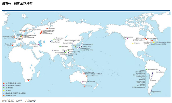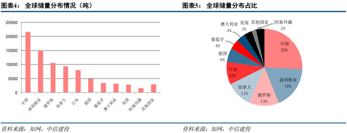 截止2017年,根据全球已知的1512处含铟矿床估计,全球铟资源量至少35.6万吨,其中已经公布资源量数据的101处矿床铟金属资源量合计约7.6万吨。中国、玻利维亚和俄罗斯是全球铟矿资源最为丰富的国家,以上三国铟矿资源量合计约占全球总量的60%,其中中国占比26%。