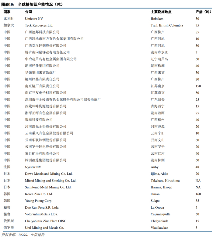 锡业股份:目前公司拥有锡冶炼产能8万吨/年、锡材产能4万吨/年、锡化工产能2.4万吨/年、阴极铜产能10万吨/年、锌冶炼产能10万吨/年,铟冶炼产能60吨/年。公司拥有铟资源储量5987吨,铟冶炼产能60吨/年,其中铟资源主要分布在子公司华联锌铟旗下,冶炼产能主要由文山锌铟负责。