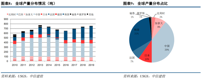 根据USGS数据,目前全球2019年生产精炼铟760吨,近五年全球产量基本维持在700吨以上。其中,中国是最大的生产国,2019年产量为300吨,同比去年持平,占全球产量的39%;韩国产量为240吨,占全球产量的31%。