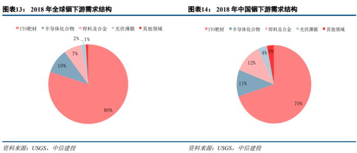 从全球下游需求来看,80%应用在平板显示领域,10%应用在半导体化合物领域。从中国来看,70%应用在平板显示领域,11%应用在半导体化合物领域。未来来看,铟在异质结电池领域以及薄膜电池领域出现大规模应用趋势,或将再一次较大规模提高铟的需求量。