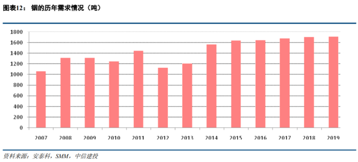 铟的需求近三年呈平稳状态。根据安泰科的数据,2007年以来全球铟的需求总体呈现上升趋势,近几年铟的需求变化不大,基本维持在1700吨左右,根据安泰科数据和我们的测算,2017-2019年铟的需求分别为1682、1704、1701吨,主要波动来自于平板显示领域变化。