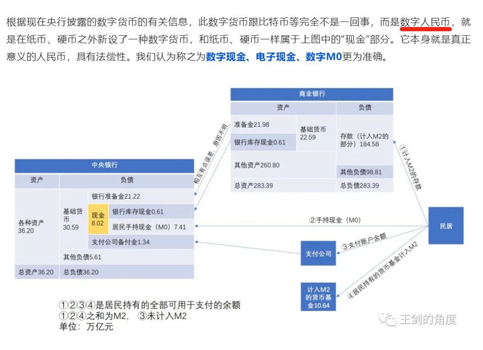 首先,我们要理解dRMB不是存款,它的地位和纸币、硬币是一样的,是人民币现金,只不过它不是纸、金属做的,而是用数字讯号“做的”现金,是材质的区别。dRMB和纸币、硬币一样大部分会计入M0(居民持有的部分计入M0,银行持有的部分则不计入,后者量很少)。
