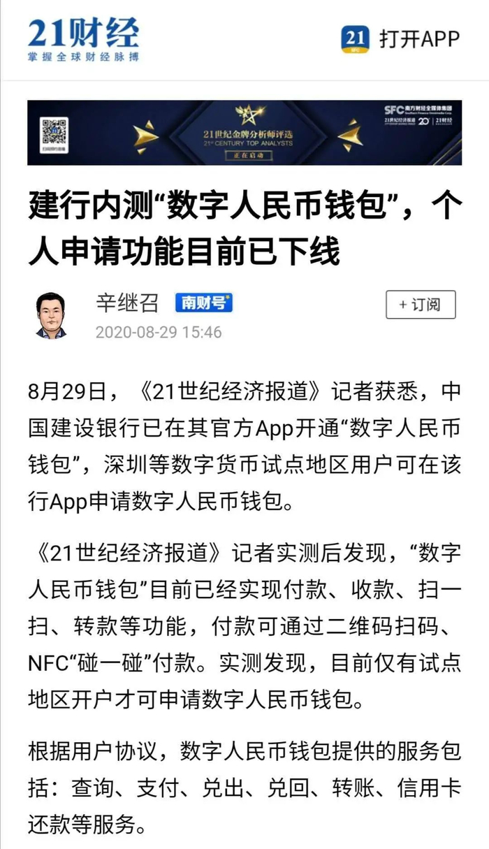 我们前期推出了很多关于央行数字货币的分析文章,但都是基于货币知识的理论分析。今日,有媒体报道某大行在其官方APP开通了“数字人民币钱包”的测试,并展示了测试界面的截图,我们终于可以来一篇更为“落地”一些的分析了。