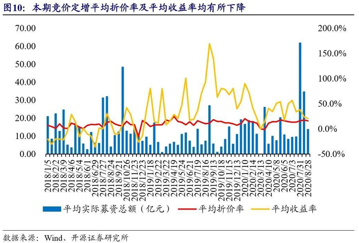 本期A股新增公告成功发行案例10例,共募资金199亿,发行案例数量及金额均显著下降。本期公告现金参与竞价定增实施7例,平均折价率16.1%,平均收益率20.9%,平均折价率及平均收益率均略有下降。2020年至今现金参与竞价定增104例,平均折价率为15.4%,收益率为41.1%。