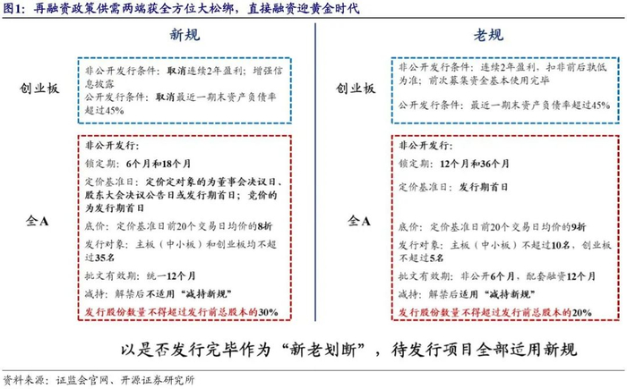 再融资新政正式发布:2020年2月14日晚,为深化金融供给侧结构性改革,完善再融资市场化约束机制,增强资本市场服务实体经济的能力,助力上市公司抗击疫情、恢复生产,证监会发布了《关于修改<上市公司证券发行管理办法>的决定》《关于修改<创业板上市公司证券发行管理暂行办法>的决定》《关于修改<上市公司非公开发行股票实施细则>的决定》(以下统称为再融资新政),自发布之日起施行。同时对《发行监管问答——关于引导规范上市公司融资行为的监管要求》进行修订,适度放宽非公开发行股票融资规模限制,并同步公布施行。再融资新政从供需两端对再融资进行了全方位的大松绑。供给端看,取消了创业板非公开发行对于连续2年盈利和前次募集资金基本使用完毕的要求,且使用进度和效果与披露情况基本一致由发行条件调整为信息披露要求;创业板公开增发的条件也取消了最近一期末资产负债率超过45%的要求;发行股份数量的上限也由发行前总股本的20%提升至30%。需求端而言,新政从提升折价率上限、缩短锁定期、放松减持限制、降低参与门槛四大维度全面提升了定增市场对于资金方的吸引力。定价定增定价基准日由发行期首日改回为董事会决议日、股东大会决议日或发行期首日,并且定价和竞价的底价由原有的定价基准日前20个交易日均价的9折提升到8折,折价率上限提升。锁定期则是由原来的12个月和36个月大幅缩短到6个月和18个月。定增股份限售期解禁之后也由原来的受减持新规限制改为不受限制。同时将参与认购对象由原来创业板不超过5名、主板(中小板)不超过10名统一改为不超过35名,单份认购金额减小,参与门槛降低。此外,非公开发行批文的有效期统一延长为12个月。