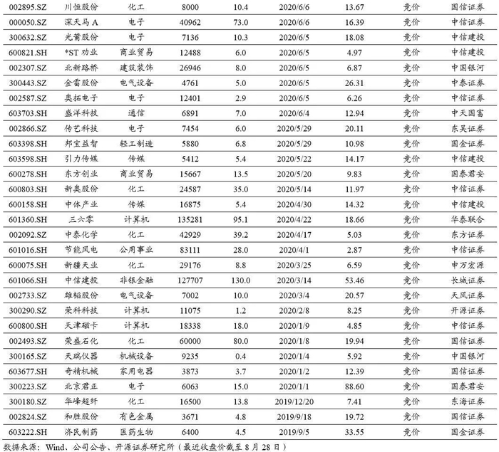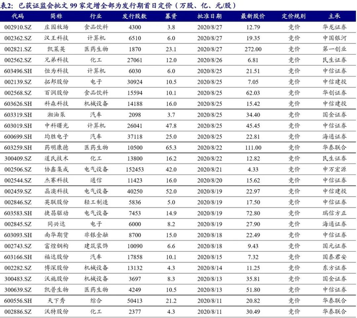本期49家公司获得发审委或并购重组委员会通过、22家公司拿到批文,过会及批文速度均大幅上升。截止到2020年8月28日,已获得证监会批准的竞价增发预案数为99家,均为发行期首日定价。