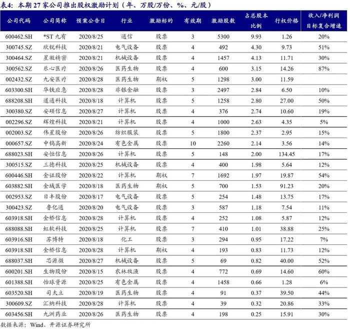 本期有27家公司推出了限制性股票或股票期权激励。其中乐心医疗、道通科技、金证股份、生物股份、芯源微、司太立、九洲药业激励力度大的同时业绩要求高。乐心医疗拟以14.26元/股的价格向59名员工授予不超过600万股(占总股本3.15%)。业绩考核要求为:2020-2022年营业收入分别不低于13.00亿元、20.00亿元、30.00亿元;道通科技拟以27.00元/股的价格向141名员工授予不超过1258万股(占总股本2.80%)。业绩考核要求为:以2019年营业收入为基数,2020-2023年营业收入增长率分别不低于50%、125%、238%、406%;金证股份拟以19.87元/股的价格向24名员工授予不超过1692万股(占总股本1.97%)。业绩考核要求为:以2019年净利润为基数,2020-2024年净利润增长率分别不低于14.81%、73.26%、130.67%、213.12%、317.50%。生物股份拟以14.60元/股的价格向248名员工授予不超过684.40万股(占总股本0.61%)。业绩考核要求为:以2019年净利润为基数,2020-2022年净利润增长率分别不低于80%、170%、360%。芯源微拟以40.00元/股的价格向51名员工授予不超过69万股(占总股本0.82%)。业绩考核要求为:以2019年营业收入为基数,2020-2022年营业收入增长率分别不低于30%、90%、200%。司太立拟以39.50元/股的价格向171名员工授予不超过91.47万股(占总股本0.37%)。业绩考核要求为:以2019年净利润为基数,2020-2022年净利润增长率分别不低于40%、90%、190%;九洲药业拟以15.91元/股的价格向95名员工授予不超过198万股(占总股本0.25%)。业绩考核要求为:以2019年净利润为基数,2020-2022年净利润增长率分别不低于30%、70%、120%。