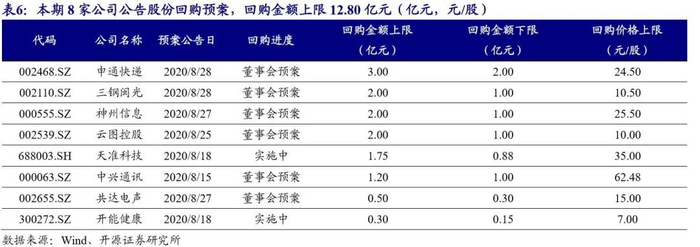 本期共8家公司推出股份回购预案,回购预案上限金额合计12.80亿元,数量及金额均大幅上升。回购上限金额由高到低分别为申通快递、三钢闽光、神州信息、云图控股、天准科技、中兴通讯、共达电声、开能健康。