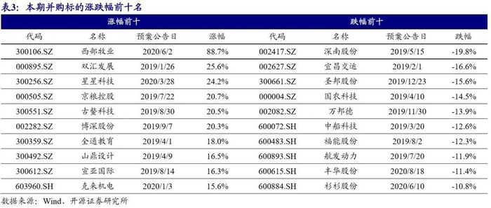本期并购重组市场情绪跟随市场小幅回暖:(1)整体看,2019年以来涉及发行股份购买资产的244家A股公司本期股价平均上涨0.6%,同期上证指数上涨1.3%,沪深300上涨3.0%,创业板上涨3.3%。(2)本期涨幅最佳为西部牧业,涨幅达到了88.7%。西部牧业近期拟以5.96元/股的价格发行股份收购天山广和100%股权(预计构成重大资产重组)及募集配套资金扩建产能,天山广和主营奶牛养殖,收购天山光合将进一步帮助公司实现对饲料生产与销售、奶牛养殖与生鲜乳供给、乳制品加工与销售等产业链的打通与融合。