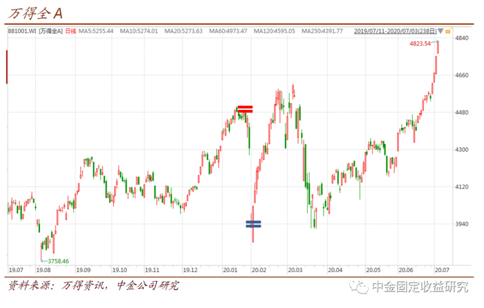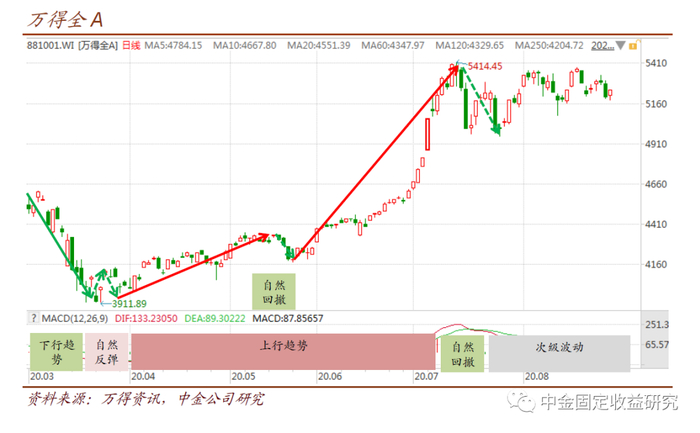 以万得全A指数为例,今年3月以来,在日线级别上,选取4.5%为阈值,则行情可以做如下划分。可以看到,由于规则明确而简单,用这个体系给行情分类以及个券的划分,都能得到一个明确的结果。