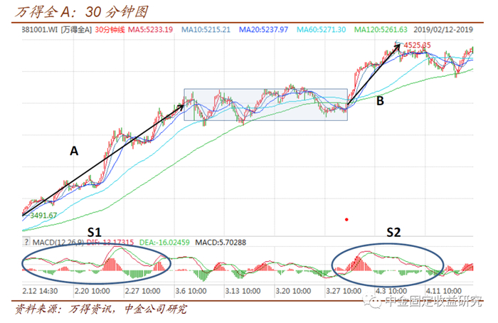 例如下图,将上述区间放大到30分钟去看——虽然直接看日线图结论更明显——可以比较A段与B段对应的MACD面积,即S1与S2。可以看到B段虽然起步时加速度并不差,但后继无力,并早早地在指数还在新高的情况下出现MACD翻绿的情况,当时即可判断为背驰出现。但要注意的是,背驰与否本质在于量能,MACD只是近似地代表了加速度,是一个比较好用的辅助指标,但远非完美,也并不是全部。